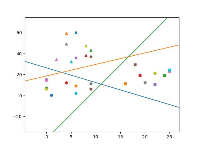 枯燥无味的输出时间!仍然是函数泛化,只是我们需要一个迭代器将三条直线一次输出,我采用的是x轴不变,y轴循环更新的方法,其实之前是想用列表添加三个y域的,但是太麻烦主要是根本不会列表添加列表与取值,甚至我打一个函数还要考虑半天它的输出(快哭了),采用此方法不会保留列表值,每次输出后自动损失y的数据。大功告成!